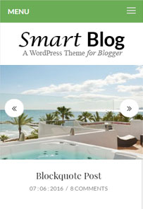 This beautiful and free SmartBlog WordPress theme is also responsive. This means whether your site visitor is looking at your site from a mobile device, touch pad, laptop or any computer. It is coded to look great everywhere. Simply means low bounce rates, better position in Google search results.