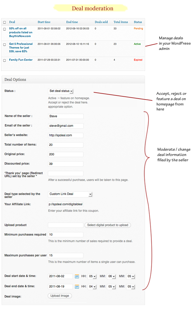 The admin then approves or reject the deal. Relevant notification email is sent to the seller. The admin can also choose to feature a deal on homepage. When a deal expires, the admin is notified, too.