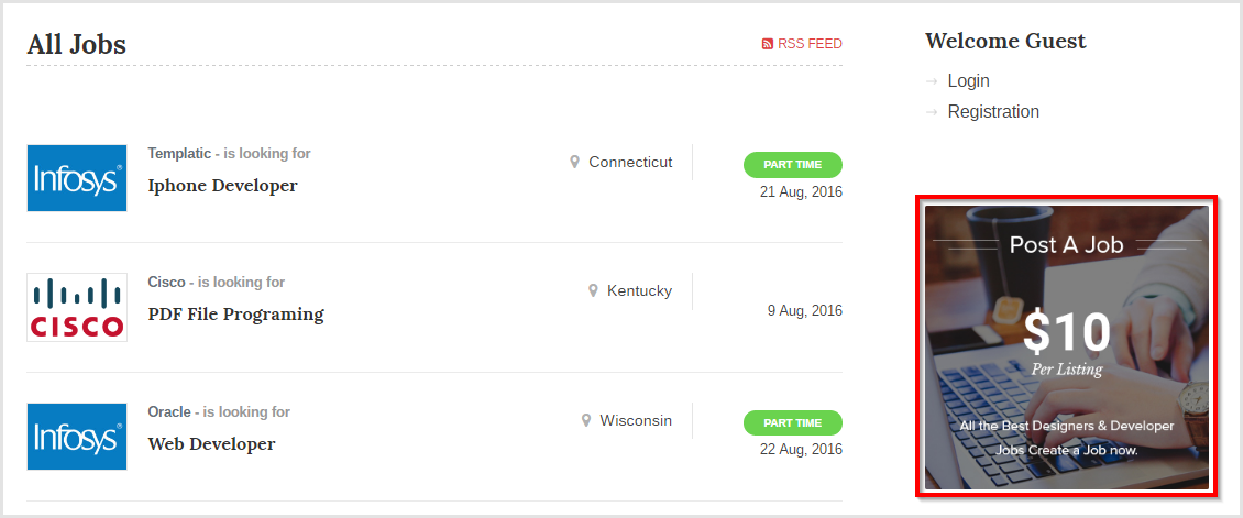 The Jobs Directory allows you to place the advertisement with the help of widgets. Just paste the advertisement code in the widget and place the widget in the screen section you want.