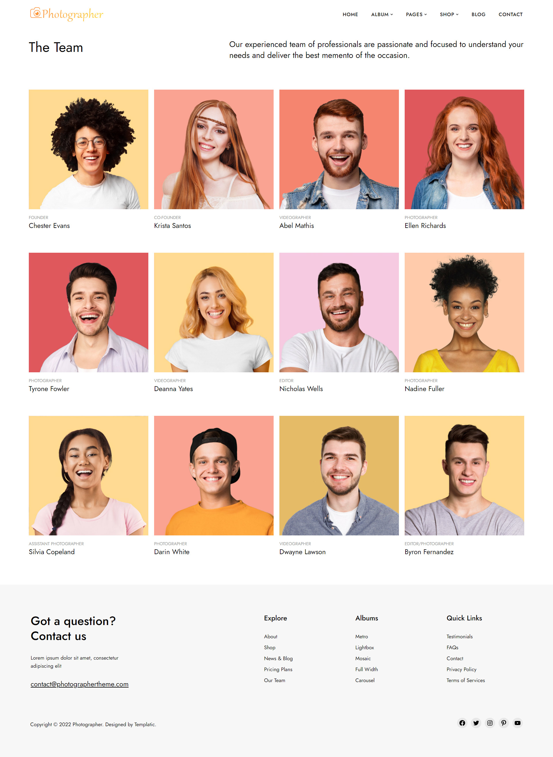 All you need to do is replace the demo content with your own fresh & unique content. The included pages are 5 types of album gallery designs, testimonials page, a pricing page with pricing tables to display your service packages, a team page, about, contact, shop pages, blog & more.