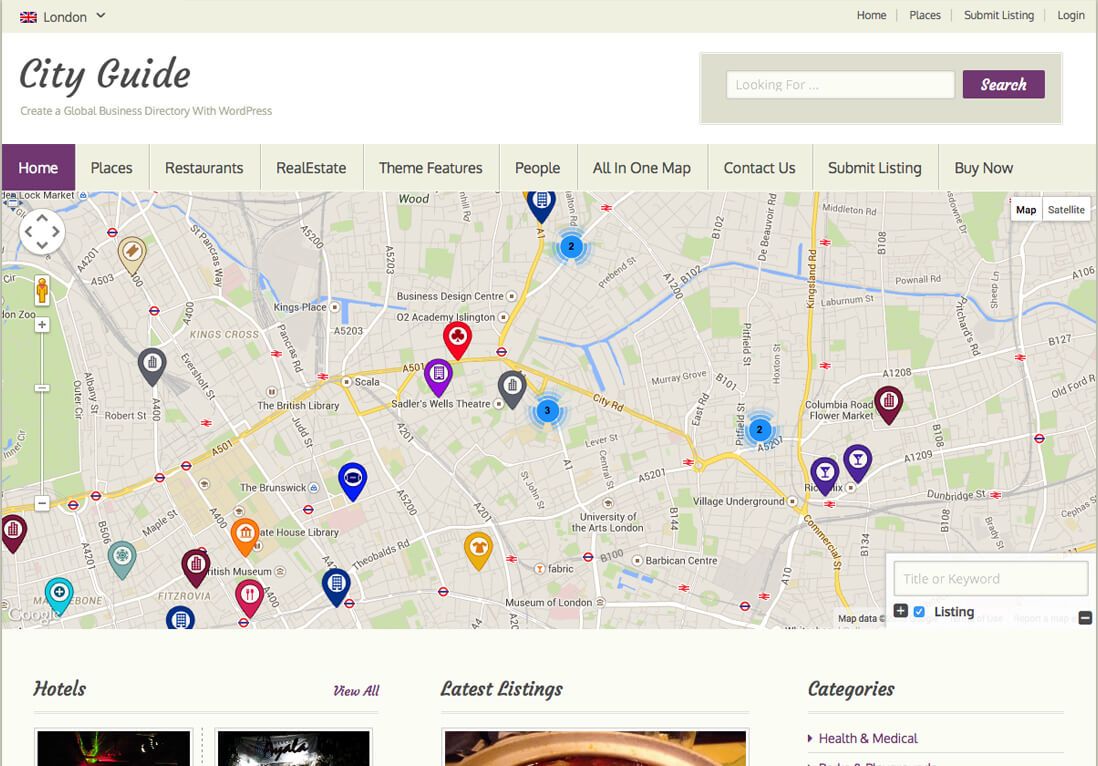 City guide theme lets you create a location based city directory with maps. Every listing added to your website, is represented graphically using on the map. You can set different map markers for different categories. The markers will show the accurate location of a listing on the map, according to the provided address. These markers are directly linked to the listing detail page. So your visitors can directly click on the map markers and get the details of that listing.